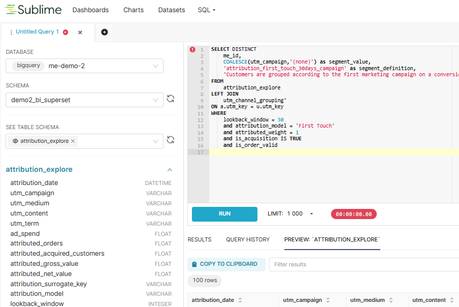 For advanced analysis, sometimes the best-structured models aren’t enough. That’s why Sublime gives analysts full access to raw event data through a built-in SQL editor – no connectors, no delays, no external tools. You get immediate visibility into every session, click, and conversion, precisely as they were captured.