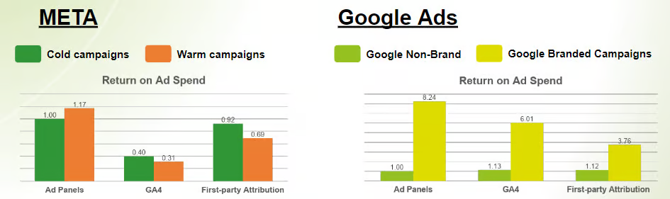 - 1st party attribution indicated that COLD campaigns (new customer acquisition) were more effective than WARM campaigns (retargeting). This contradicts the results from the Meta dashboard.