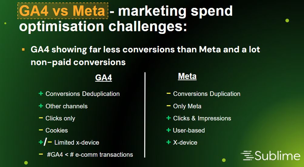 - Meta ROAS results were significantly higher in the advertising dashboard than in GA4. 1st party attribution showed results in between these tools.