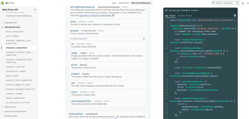 The Web Pixel API, operating as a sandbox outside the browser window, offers enormous customization possibilities for tracking. It supports over 15 standard events and numerous parameters, including selling plans, cart ID, customer ID, and product data. This capability enables tracking features that were not feasible in the previous approach without developer support, such as distinguishing between subscription orders and one-time purchases and passing such information to GA4 or marketing pixels.